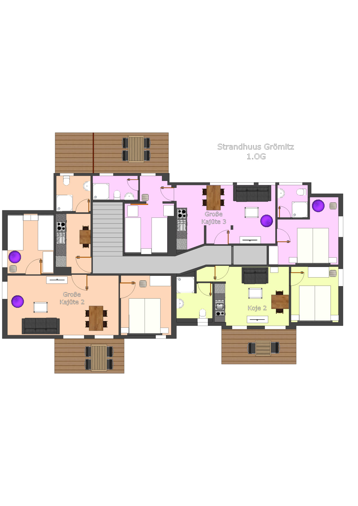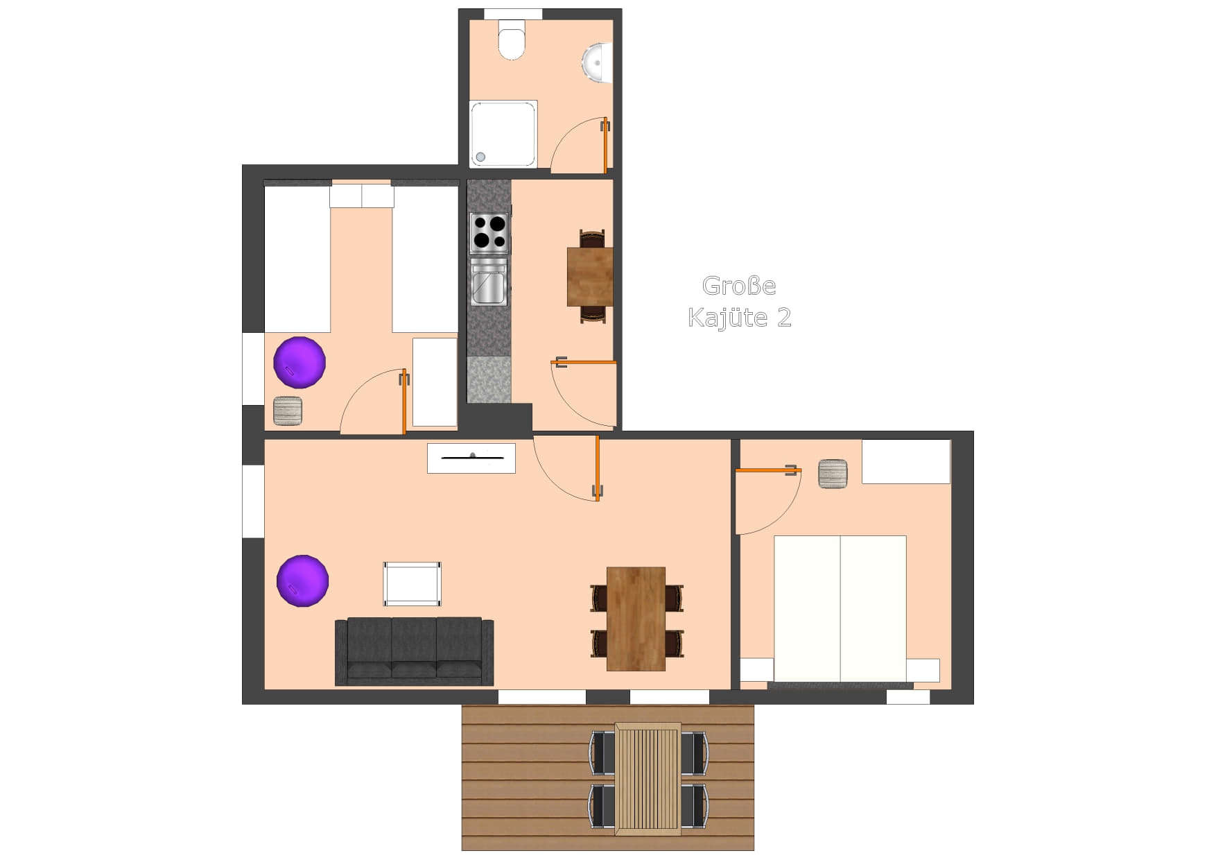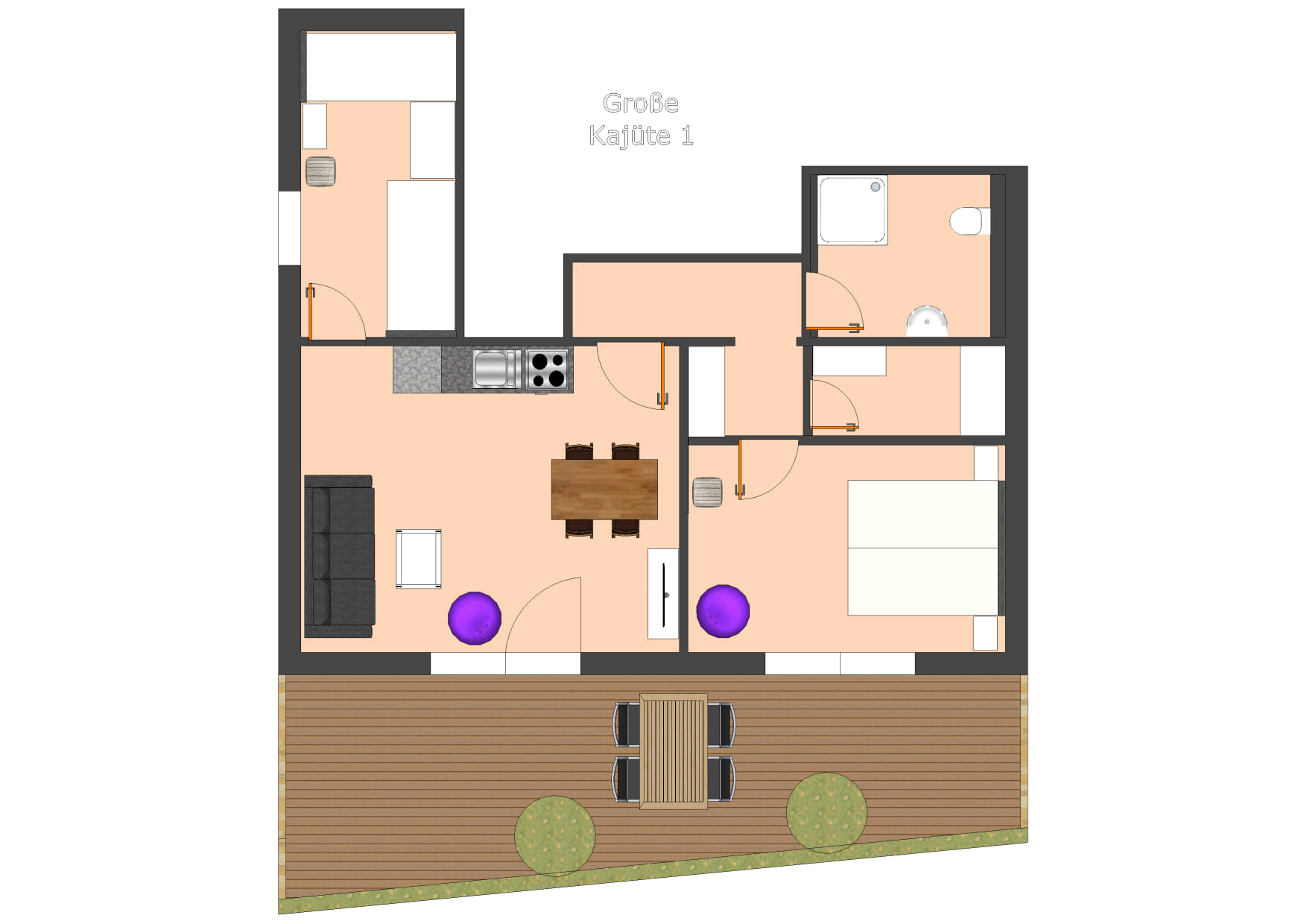 Eigenständiger Bungalow mit 2 Schlafzimmern, 2 Bädern, 2 Terrassen und eigener Fass-Sauna.